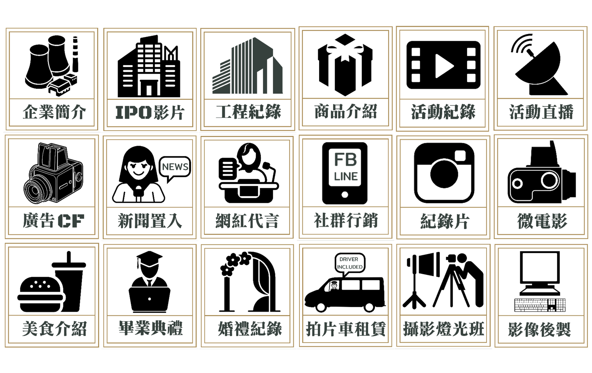 社群短影音行銷/ 各式開箱文製作/ 工程紀錄/ IPO影片製作/ 企業簡介/ 活動紀錄/ 直播行銷/ 工商攝影/ 畢業典禮錄影/ 影像製作/ 廣告影片製作/ 短影音製/ 醫美宣傳/ 紀錄片/工商廣告/